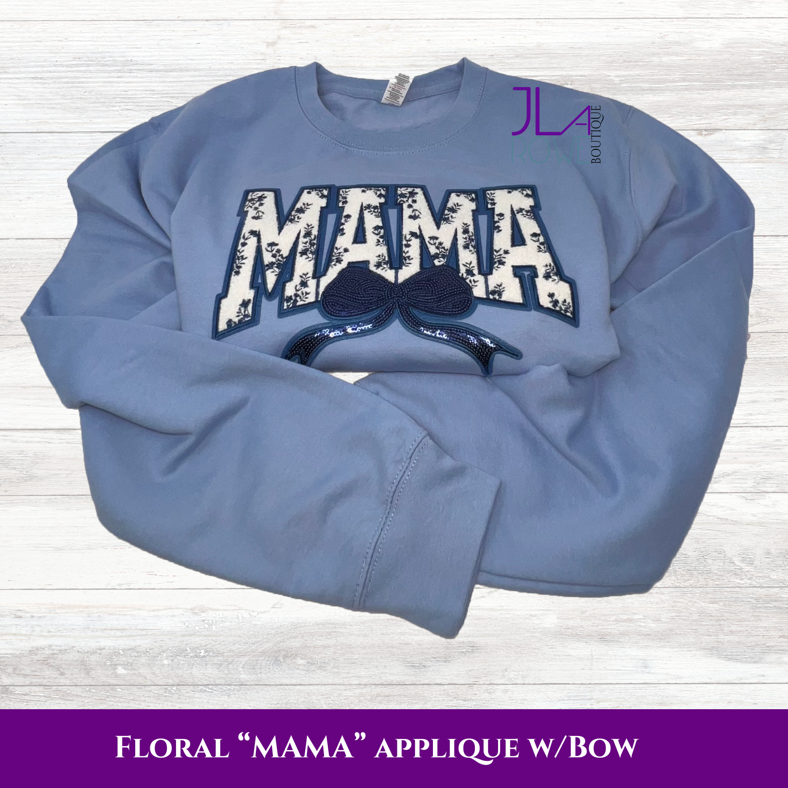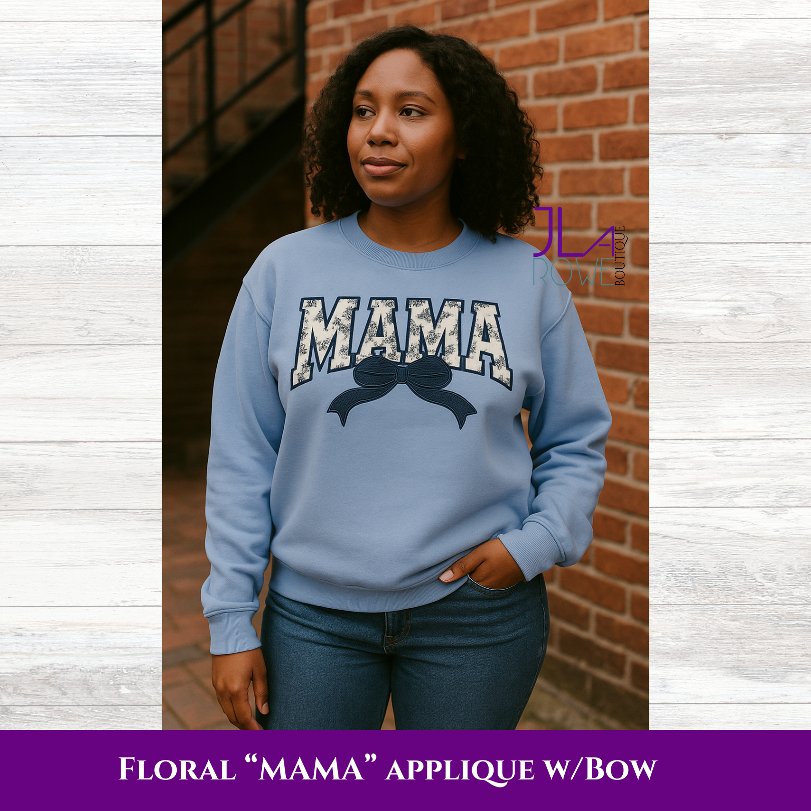 Celebrate motherhood in style with this soft and cozy light blue MAMA sweatshirt! Featuring bold floral appliqué letters and a beautifully embroidered navy bow, this crewneck blends comfort with timeless charm. Perfect for busy moms who want to stay comfy yet stylish, it’s an ideal gift for Mother’s Day, birthdays, baby showers, or just because.