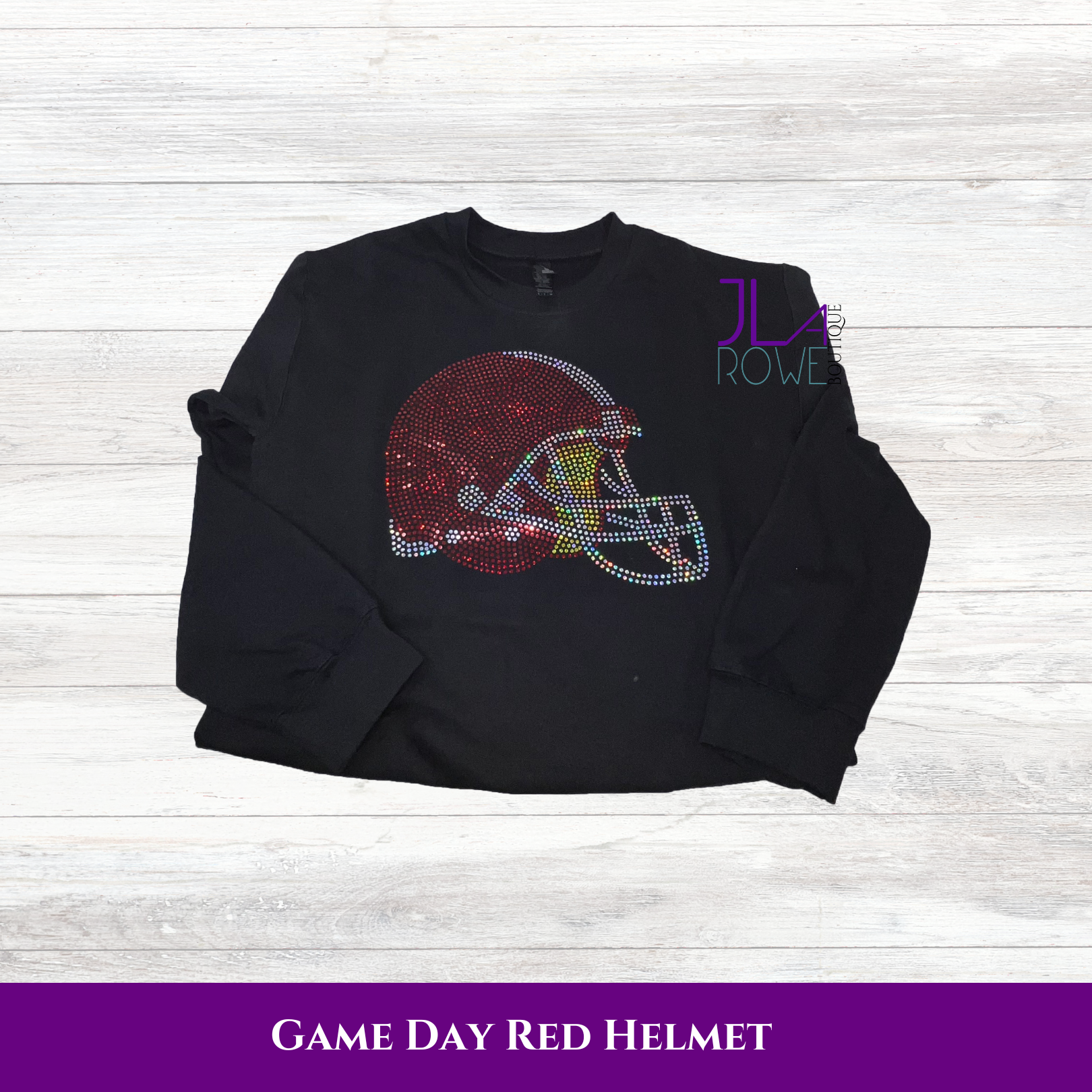 Shine bright on game day with this dazzling Rhinestone Football Helmet Sweatshirt! Designed for true football fans, this unisex sweatshirt features a stunning helmet made entirely of sparkling foil bling that catch the light from every angle. Crafted from soft, breathable cotton, it combines comfort with show-stopping style. Perfect for tailgates, game day parties, or casual wear, this shirt lets your team spirit sparkle all season long.